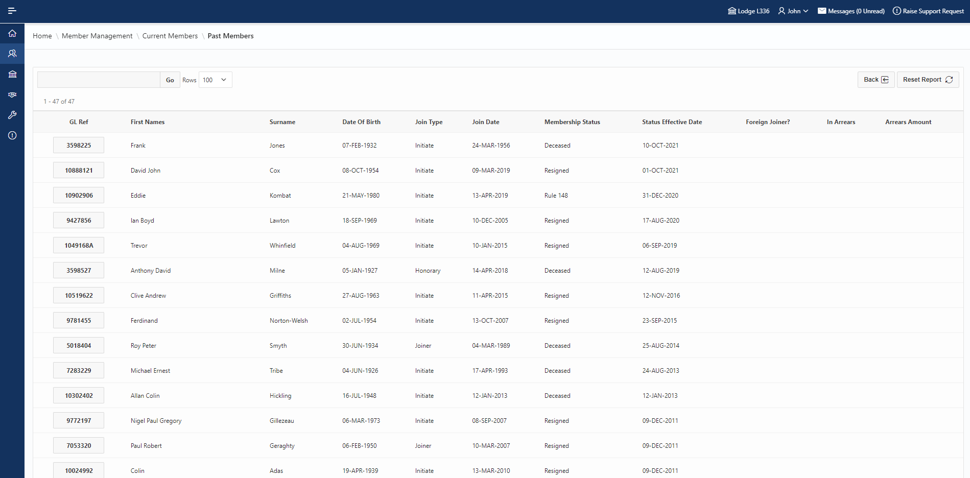 The primary use of the 'Past Members' list is for you to review memberships of your Lodge/Chapter that have ended, regardless of the reason. You can access a past member's record, but can only see a limited amount of information. The only changes you can make to a past member's record is to change whether they are in arrears, or amend the amount they are in arrears.