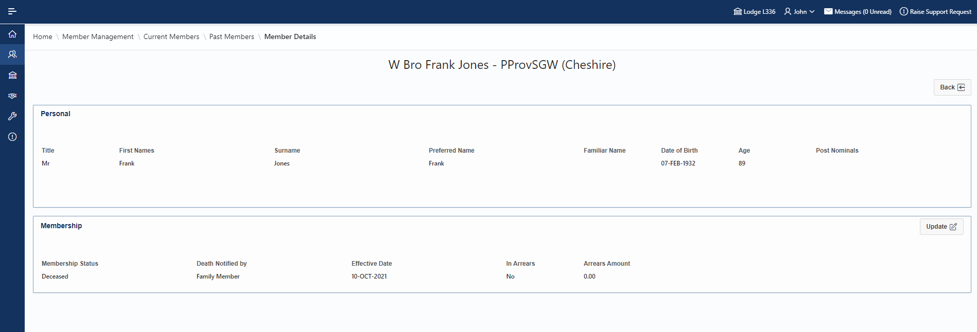 The 'Past Members' 'Member Details' screen shows you information related to a member who no longer holds membership of your Lodge/Chapter. The amount of information available is reduced when compared to the 'Current Members' 'Member Details' screen. You are also restricted to only amend the member's 'In Arrears' status and 'Arrears Amount'.