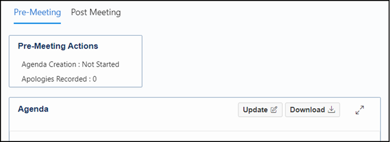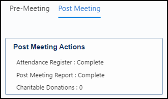 Post Meeting Report status always ‘Not Started’ bug fix Bug addressed that showed ‘Post Meeting Report’ as being ‘Not Started’, even when all agenda items had been appropriately updated. Status will now be ‘Not Started’, ‘In Progress’ or ‘Complete’.
