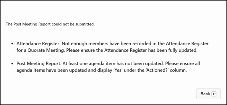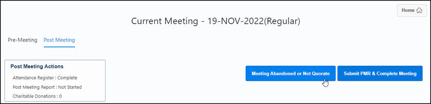 New ‘Abandoned or Not Quorate’ button New button added to manually record a meeting as abandoned or not quorate, separating it from the ‘Submit PMR & Complete Meeting’ button, which previously automatically calculated it based on the Attendance Register status.