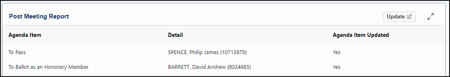 Amended ‘Updated?’ label to ‘Agenda Item Updated’ Amended the label on the ‘Post Meeting Report’ and Post Meeting Report ‘Update’ screen to use a label of ‘Agenda Item Updated’, rather than ‘Updated?’ which was confusing.