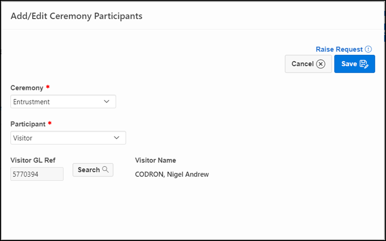 Blank GL Ref Ceremonial Activities Fixed a bug that could occur when saving a Visitor as Ceremony Participant without searching, resulting in a blank GL Ref being stored and an error when submitting the PMR.