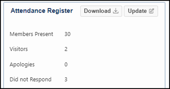 Download Attendance Register The Attendance Register can now be downloaded, using the newly added ‘Download’ button available both within the ‘Apologies Received’ region of the Pre-Meeting tab, and the ‘Attendance Register’ section of the Post Meeting tab.