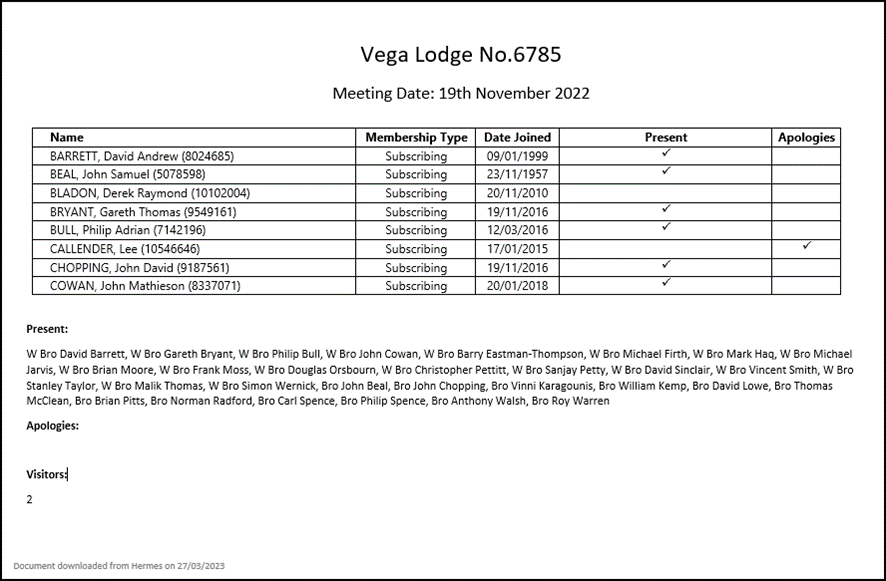 Attendance Register Document The Attendance Register Document can be downloaded using the newly added ‘Download’ buttons, which serves 3 primary purposes: 1. Prior to the meeting to be used as a sign in sheet or tick sheet, to record which members attended a meeting. This should then help Hermes Administrators with entering the attendance in to Hermes. 2. After the Attendance Register has been completed to be stored for the Lodge/Chapter records. 3. After the Attendance Register has been completed the final section of the Attendance Register document can be copied and pasted in to the Minutes.