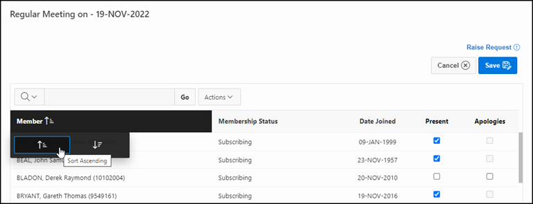 Columns in Attendance Register can now be sorted The Member Column, as well as the newly added Membership Type and Date Joined columns, can now be sorted Ascending or Descending as required. The default sort for the Attendance Register will also now be alphabetical by Member, meaning the list is sorted by Surname ascending.